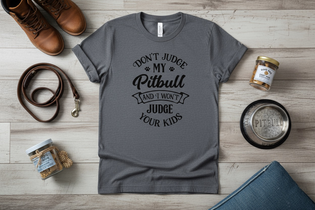 Show off your love for pitbulls with a playful twist! This design proudly says, "Don't Judge My Pitbull and I Won't Judge Your Kids," highlighting the unique bond you share. Perfect for pitbull owners who know these dogs are full of heart and deserve a little extra understanding—and a good laugh. Wear it to spark conversations and celebrate your favorite furry friend with humor and pride.